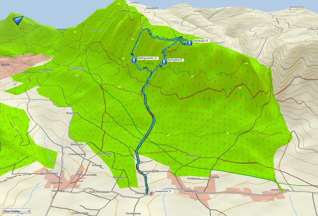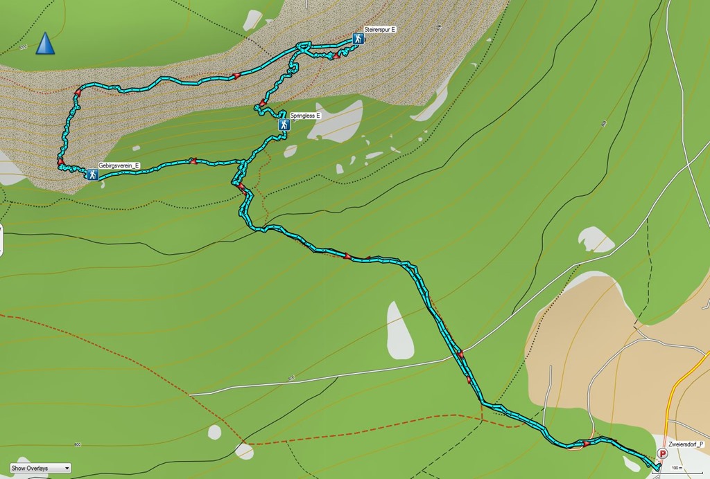 A táv (Zweiersdorf, Springlessteig, Wandfußsteig, Gebirgsvereinsteig, Hubertushaus, Steirerspur, Hubertushaus, Springlessteig, Zweiersdorf) 4.5 km, 500 m szintemelkedés bruttó 3:00 óra