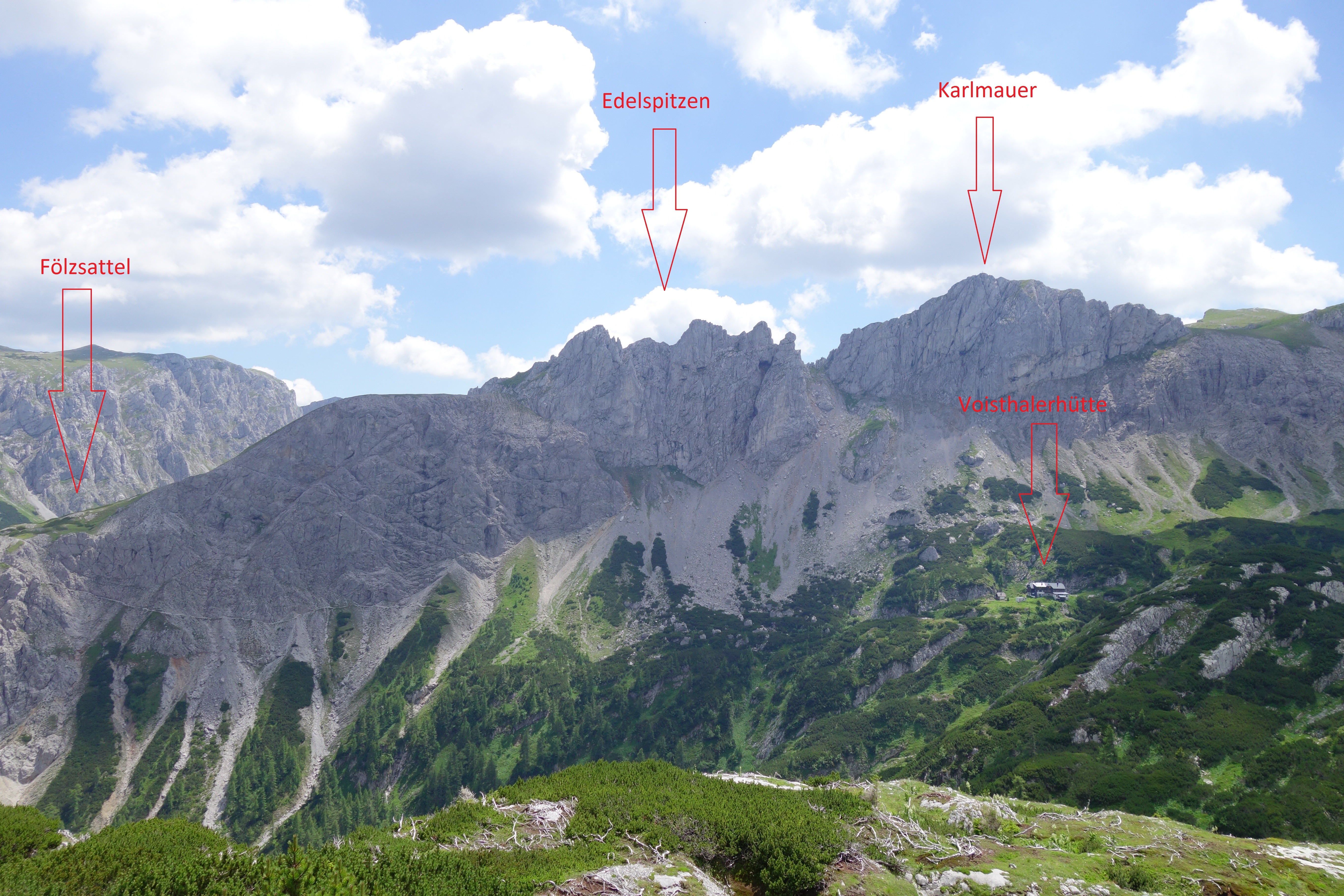 Az előző beszámolómban említett csipkés szélű hegyeknek (amitől tudniillik az a bizonyos Dolomiten-Feeling kialakul) van rendes nevük is. Edelspitzen, azaz Nemescsipkék, mellette jobbról a Karlmauer és alul a Voisthalerhütte. Az orientáció kedvéért még a közismertebb Fölzsattelt is bejelöltem. A kép a Jägermeyer-Steigen (a Kühreichkarból) készült. Kattint teljes felbontás. Ja, és megjegyzem ezekre a hegyekre (sajnos) kijelölt turistaút nem vezet. Találtam viszont egy beszámolót, Pauli utat talált ebben a vadonban is: http://www.paulis-tourenbuch.at/2012/20121124_kaefereck.html