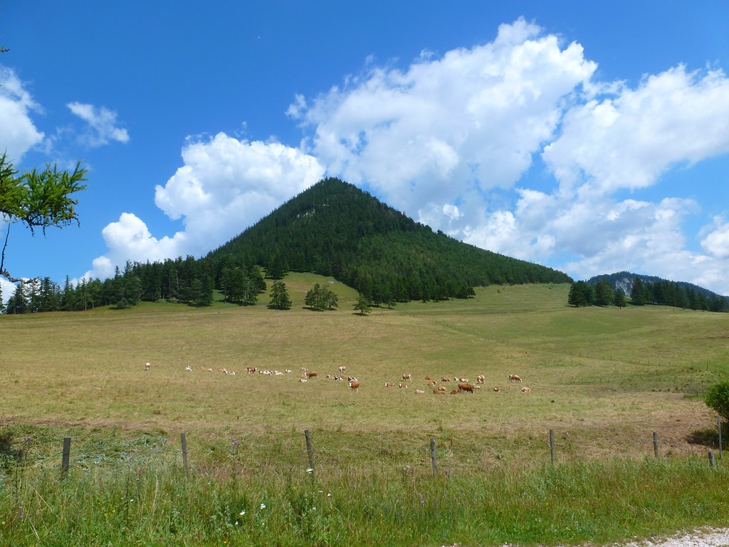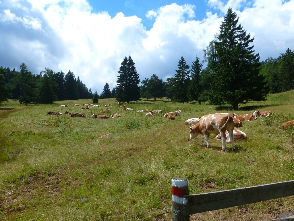 Egy tehenekkel jócskán benépesült legelőn lyukadok ki a Schober alatt. Megkezdhetem a végső ereszkedést. Itt is érdemes a nyerget egy kicsit lejjebb eszteni és odafigyelni a friss és csúszós tehéntányérokra. A meredek legelő végében ismét bringaátemelés a kerítésen.