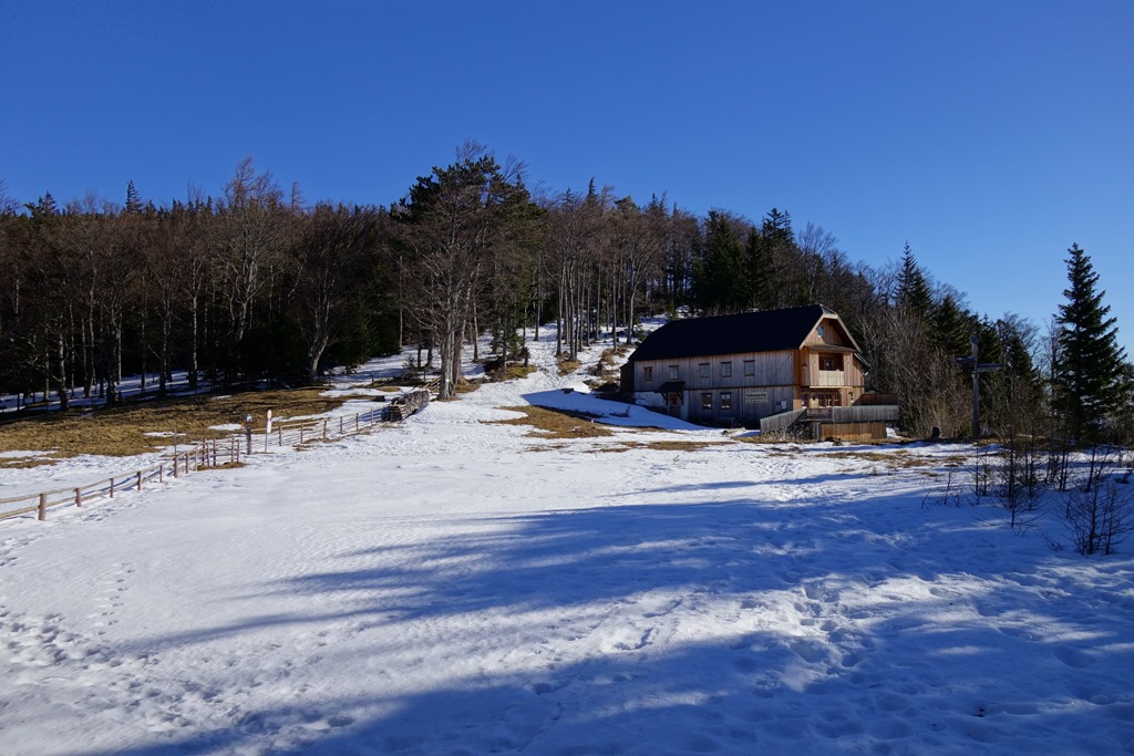 11:05-kor érem el a télen elhagyatottan ásítozó Waldburganger-Hüttet. Felbaktatok a menedékház napsütötte teraszára is, ahol az egyik padon töltök magamnak némi frissítőt. Ejnye, de jól esik! Sikerült jól megizzadnom, köszönet a langymeleg plusz fokoknak.