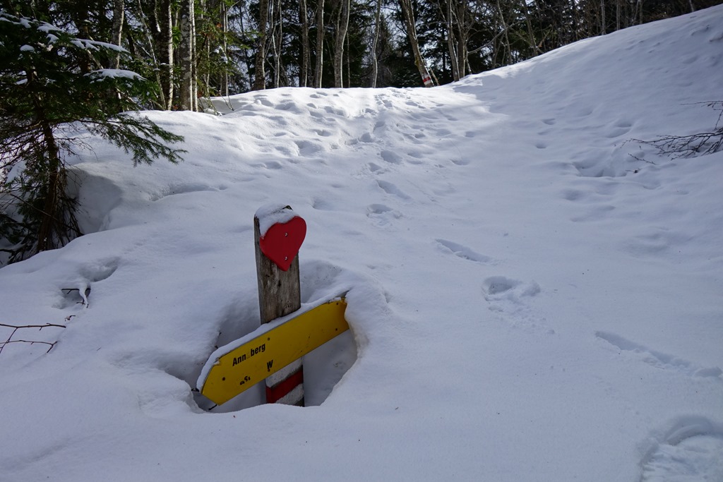 A Hennesteck csúcsa kissé eldugva, kiesik a jelzett turistaútból, így hát improvizálok. Követném a GPS-en meghúzott képzeletbeli vonalam, de az egy mély árokba vinne. Maradok hát, kissé jobbra tartva, egy frissen húzott sítalppár nyomában, ami valóban elvezet az eldugott csúcskereszthez (fenti kép). A sítúrások a hegy északi oldalán csusszannak le. Következő célom viszont a nyugati irányban található Anna-Alm. Muszáj tehát meglelnem a rendes turistaút vonalát magamnak. Fenyőfák között lavírozva, érintetlen hótakarót bontva, egy érdekes feladat. Némi útkeresés után gond nélkül visszatalálok a továbbiakban követendő ösvényre.