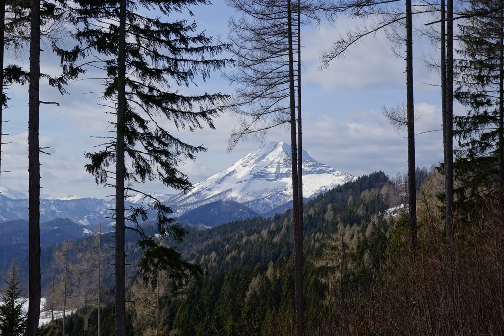 Menekülök is tehát az Anna-Almról. Szerencsére csodás látvány feledteti az iménti kulináris ürömöket. Az Ötscher és a Gemeindealpe. Fantasztikus! Északról kerülöm tehát meg a Hennsestecket, majd egy nagy kanyart leírva délnek, majd délkeletnek fordul a turistaút. Közben egyre hosszabb időre kukucskál ki a nap. Mire a Reidl síterep aljára érek, már folyamatosan ragyog az égről.