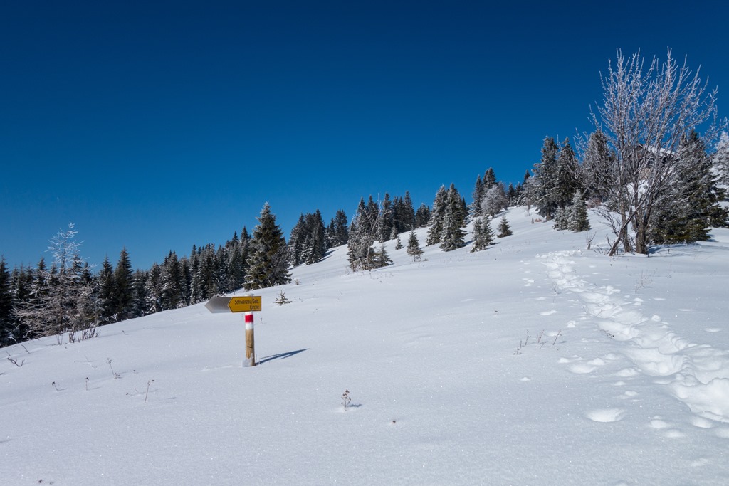 Az általam követtet nyomok a Waldfreundehütte téli szállásra kanyarodnak el, így a közeli csúcskeresztig érintetlen mély hóban gázolhatok. Idefenn, bár a nap ragyog, valamelyest hűvösebb van, és a hó tapadása nem olyan virulens.