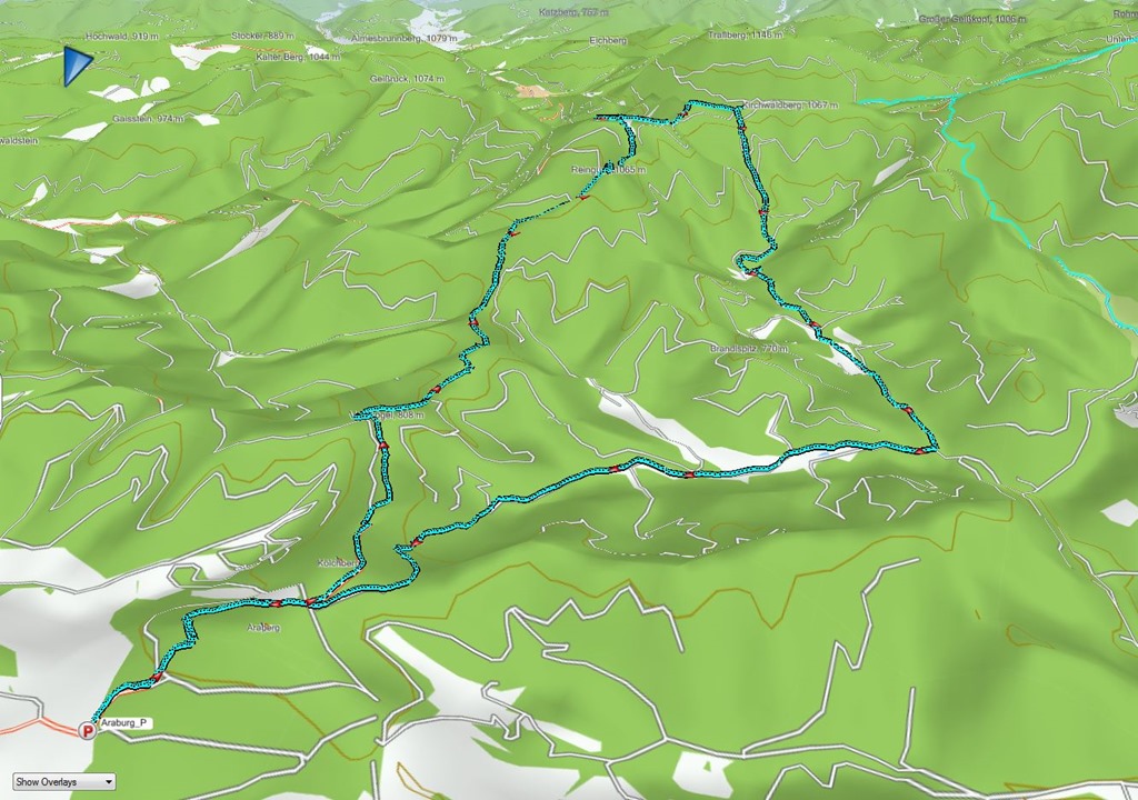 Az út, lassan de biztosan emelkedik. Először csak észrevétlenül, majd egyre jobban bekeményít. Levegő után sebesen kapkodva érkezünk vissza az Araberg alá (14:40), majd az Araburg alatt elmasírozva, kellemesen kifáradva érkezünk vissza a kiindulópontba (15:07).