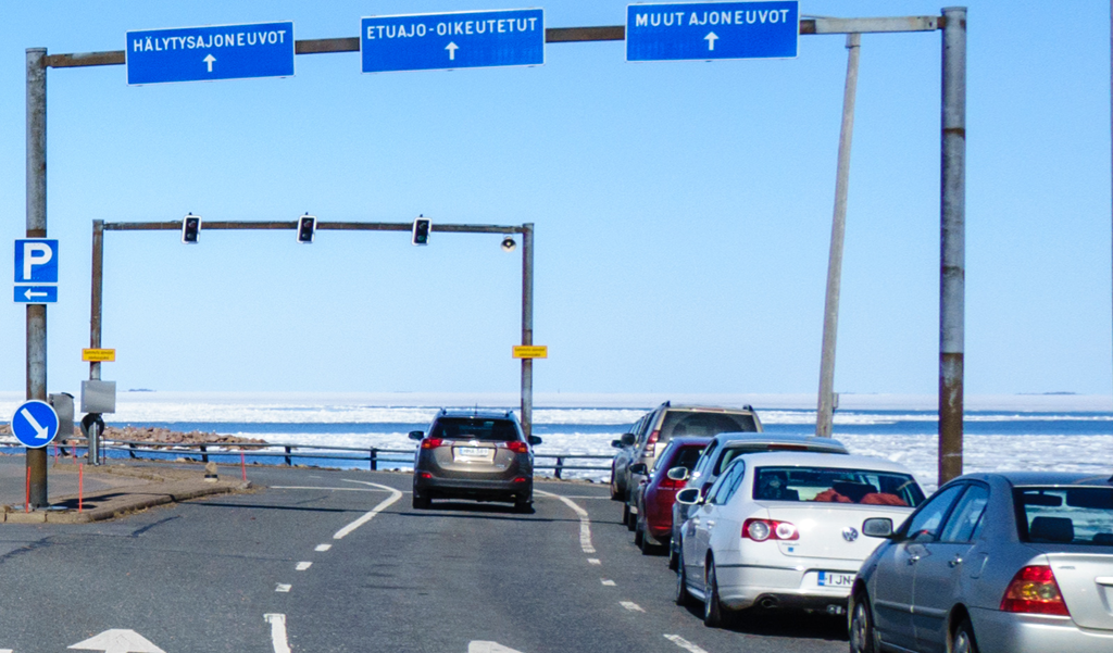 Komppal átkeltünk Hailuoto szigetére. Három sáv van kijelölve a várakozó autósoknak (lásd a fenti képet). A jobboldali sor hosszan kígyózik. Mi is odaállunk. Mint kiderül, az ebben a sávban várakozók hajthatnak fel utolsóként a kompra. A másik két sáv üres, később érkezik három jármű a középsőbe. A sávok feletti feliratokat nem értjük, de csodáljuk a békés polgárok fegyelmét. Senki sem próbál trükközni, előzni, megrövidíteni a várakozást azzal, hogy az üres sávok valamelyikébe tahóskodik. Itthon szótárazok és kiderítem: