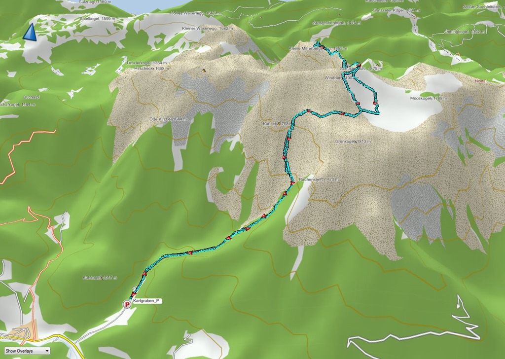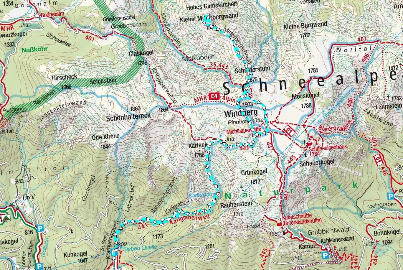 Célom tehát, hogy a jövőben majd több felvonásban, ezekre a területekre is fényt derítsek. Ez alkalommal a sötét és zord Karlgrabenon át szeretném elérni a platót, majd a Windberget érintve a Schneelape egyik jellegzetességére, a Klenier Mitterbergwadra (1863m) feljutni.