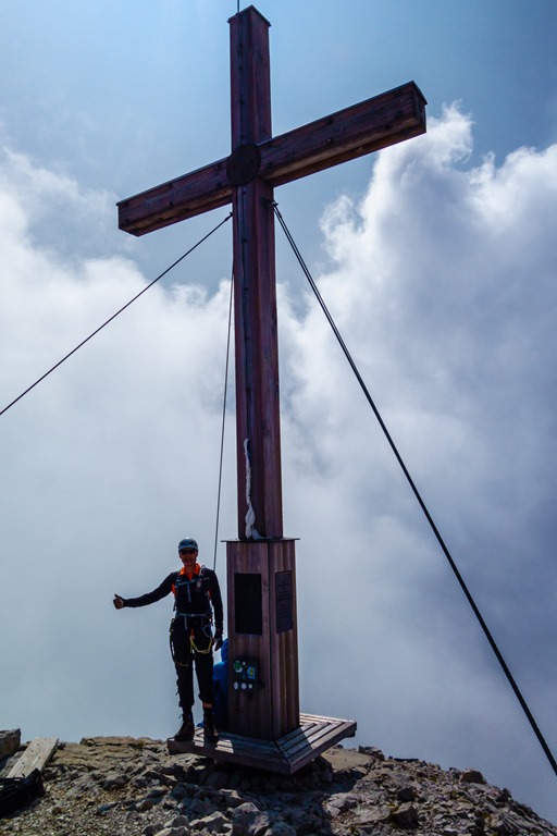 A pára gyakran teljesen eltakarja célomat. Időnként fel-fellibben a köd és sikerül kivennem a csúcskeresztet. A tövében néhány korai látogatót látok. A drótköteles szakaszok egyre könnyebbek, így aztán a karabinerek az övemen maradnak. A haladás olyan könnyű, hogy egyszerűen nincs rájuk szükség.