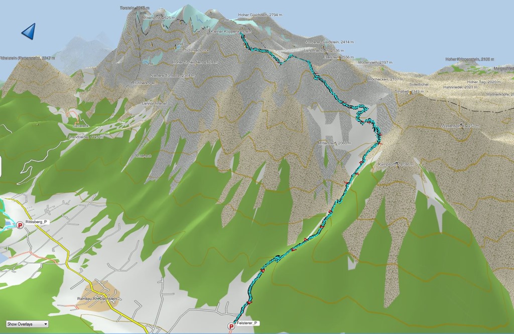 Alig 15-20 percig tarthat lejönni a hegy északi oldalán. Az út azonnal szelídül, amint elérem a plató szintjét. Egy kereszteződésben rátérek a Ramsauer Höhenwegre, mely egy kis emelkedő árán visszavisz a Gruberscharteba (12:52).