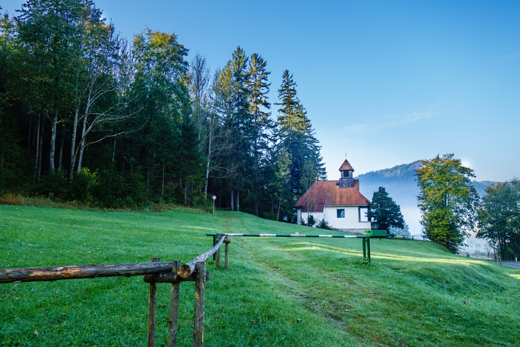 7:50-kor, vacogtató 4 C fokban indulok körutamra a Klostertalból. Aszfalton haladok nyugati irányba Vois felé, a tanyán át egészen egy kápolnáig (8:20 == fenti kép) ahonnan a Steinlehgrabenben lévő Fleischersteig indul. Sajnálattal veszem tudomásul, hogy a hegy északi oldalán napsütésre egyelőre hiába áhítozom. A turistaút jól jelzett, a platóhoz közeledve egyre meredekebben veszi a szerpentineket, mígnem az út végén már sziklát is kell fogni, imígyen az út felső szakasza eléri az 1- szintet.