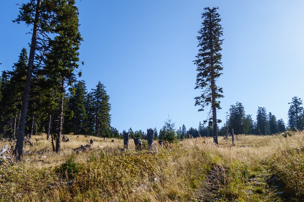 A platón (10:04) végre napsütés fogad. A táj megegyezik a képzeletem szültével. Nem is csoda, hogy a vidék nem a legfelkapottabb attrakciók egyike. Nagy kiterjedésű mezők és fenyvesek váltogatják egymást (lenti kép). A jelentős tengerszint feletti magasság ellenére gyakorlatilag nincs kilátás a környező világra. Még a szomszédos Schneeberg szelíd füves háta is csak később bukkan elő, a ki tudja hányadik erdőliget mögött. A tájékozódást fémkarók segítik. Az erdőben jobb résen lenni, mert könnyű elvéteni a kijelölt utat.