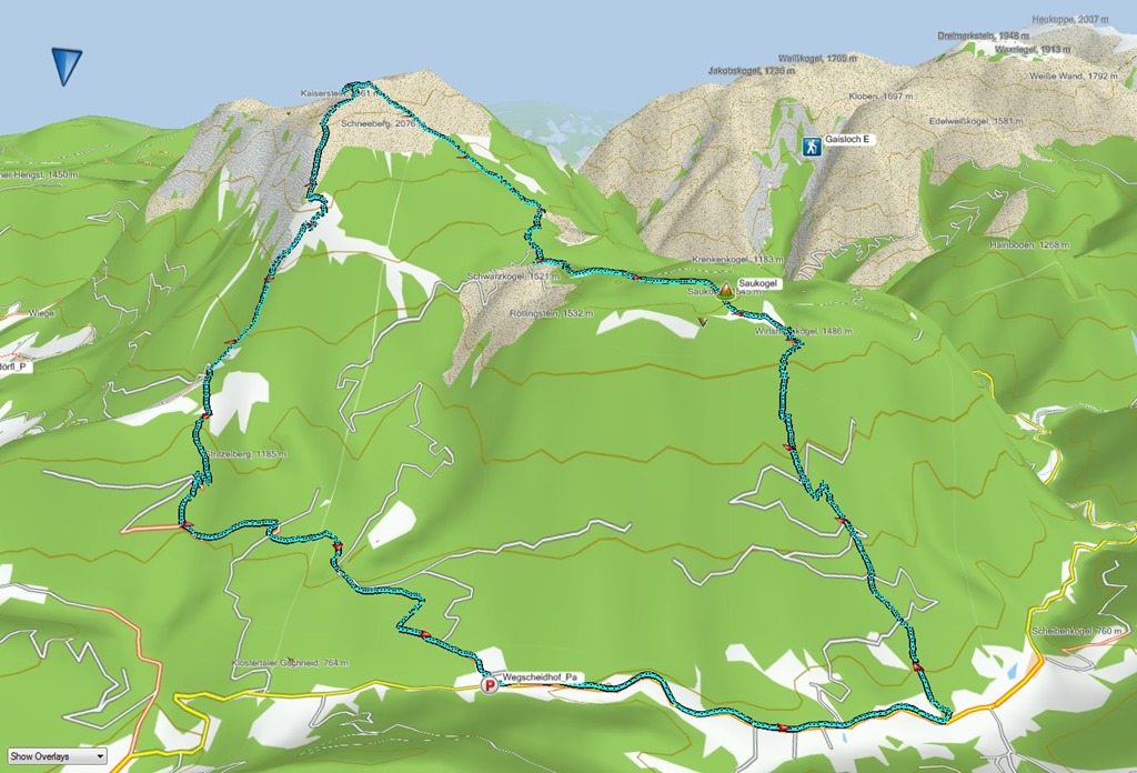 Hosszú kihagyás után óvatosan tervezek. Az alapterv (A variáns) értelmében Wegscheidhofból indulok Vois felé, hogy a Steinlehgrabenon át jussak fel a Kuhschneebergre. Miután átvágok a platón, kelet felé fordulva az ismert Fadenwegen elérem az Edelweißhüttet, majd onnan a 231-es turistaúton visszaereszkedem a kiindulópontba. A vérmes B variáns értelmében a Fadenweget elérve nem az Edelweißhütte felé, hanem ellenkező irányba fordulva felbaktatok még a Schneebergre is.