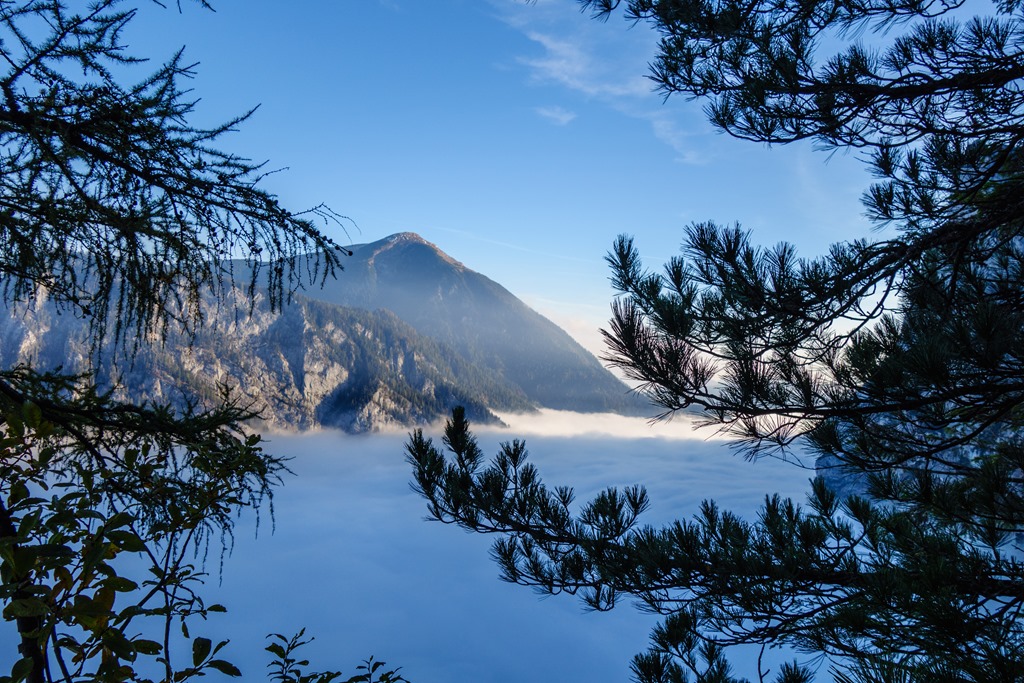 Fellélegzem, amikor végre a páratenger fölé érek. A látvány gyönyörű (lenti kép). Az Ennstalt kitölti a sűrű páratenger. A Wasserfallweg helyenként évszázados nittekkel biztosított szakasza szerencsére már a ködtenger felett van és tehát viszonylag száraz. 8:50-kor kezdem meg a mászást a szakaszon. 20 perc elteltével (9:11) gondok nélkül érem el az Ebersanger völgyet.