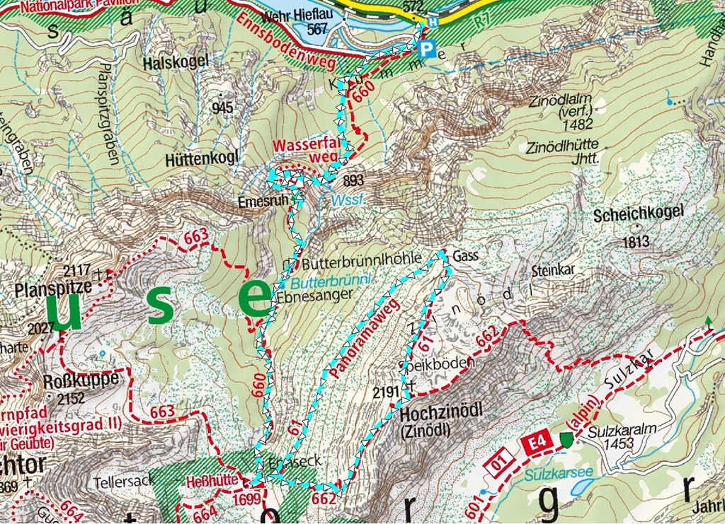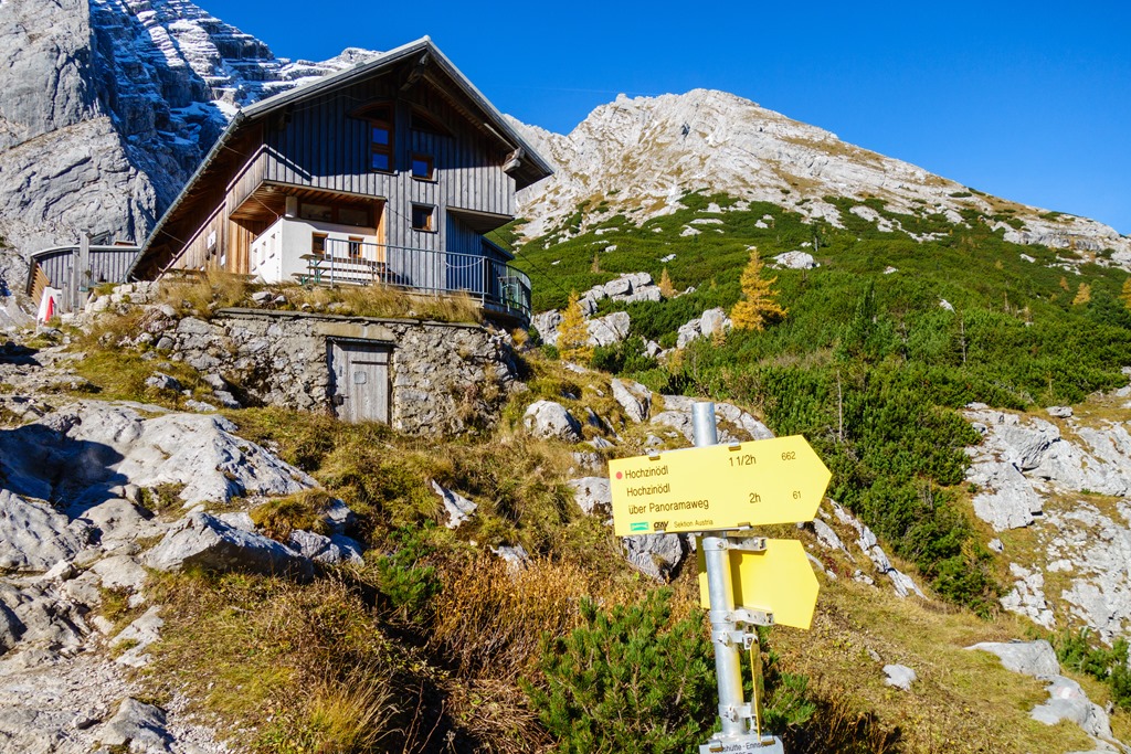 A Panoramaweg a Zinödl északi oldalán egy hajtűkanyarban délnek fordul és a hegy nyugati oldalán fut vissza a Hesshütte felé. A látványban gazdag út nyugodt tempót diktálva sem tart tovább 1 és egynegyed óránál. 12:50-kor vagyok ismét a Hesshütte alatt, de immár betérek, hogy elköltsem a jól megszolgált ebédem.