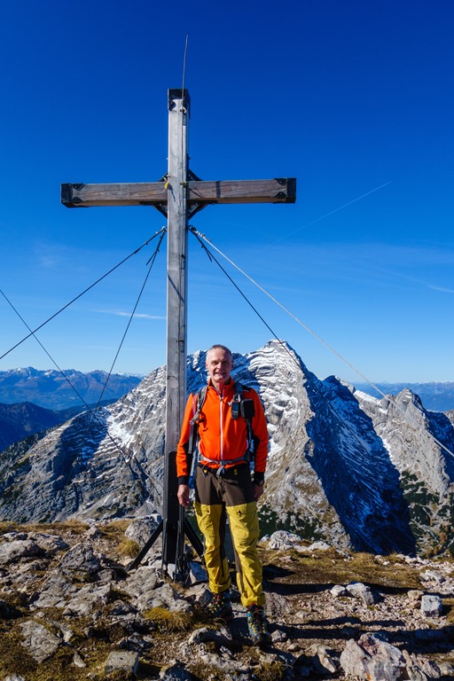 11:28-kor érkezem a csúcsra. Élénk szél fogad. A tökéletes kék égbe ágyazott panoráma lenyűgözi. Mióta túrázom, ilyen pompában még nem volt részem. Kattogtatom is a fényképezőmet rendesen. A lenti tarka őszi erdő, a középszinten húzódó sziklavilág és a felsőbb havas rétegek alkotta ötvözet látványától libabőrös vagyok. Avagy csak a szél citeráz rajtam?