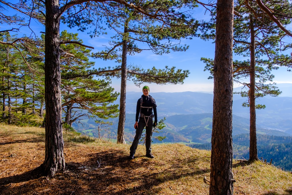 A továbbiakban a legkisebb ellenállás útján, illetve tehát amerre az erdő ritkásabb, próbálunk visszatalálni a Gahnsleiten taréján futó turistaútra. Ezután még elnézünk a Rote Wand tetején trónoló kilátóba (12:10 – lenti kép), melyet téli hótalpazásomkor elvétettem. Ha az élénk déli szél nem hűtené oly hevesen kedélyeinket, a remek látványra való tekintettel még bizonyára elidőznénk itt. Közben meg is éhezünk. A december végéig nyitva tartó Pottschaherütte felé vesszük tehát az irányt.