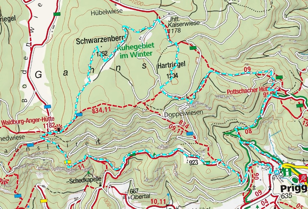 8:45-kor indulunk Prigglitzből és a Gahnsleitenen át közelítjük meg az immár téli álomba szenderült Waldburgangerhüttet (10:30). Itt pihenünk egy keveset a kunyhó szép napos teraszán, majd indulunk tovább a tulajdonképpeni felderítésre.