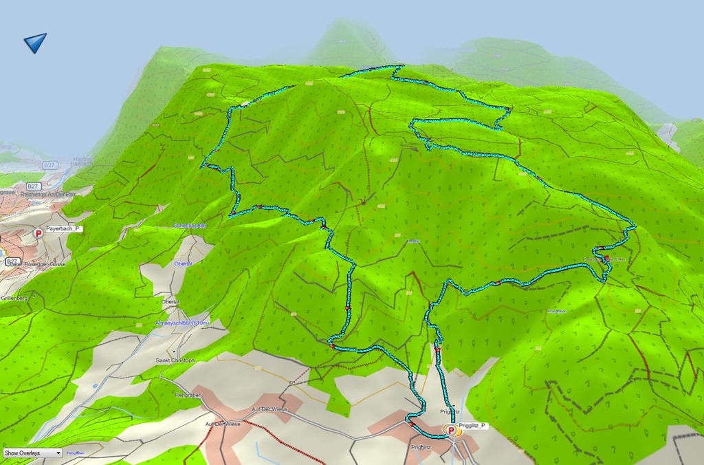 A Schwarzenberg déli lejtőjén ereszkedünk vissza egy a térképen berajzolt erdészeti útra. Északkeli irányba követjük mindaddig, amíg el nem érjük a hivatalosan is zölddel jelölt turistautat. Közben Cirminek még nem volt elég a cserkészetből, és javasolja a Hartrigel (1204m) bevételét is. Elhagyjuk tehát a jelölt ösvényt és toronyiránt úttalanul, az aljnövényzetet óvatosan kerülgetve beazonosítjuk a természetesen ismét csak egy erdő kellős közepén árválkodó Hartriegelt (11:55).