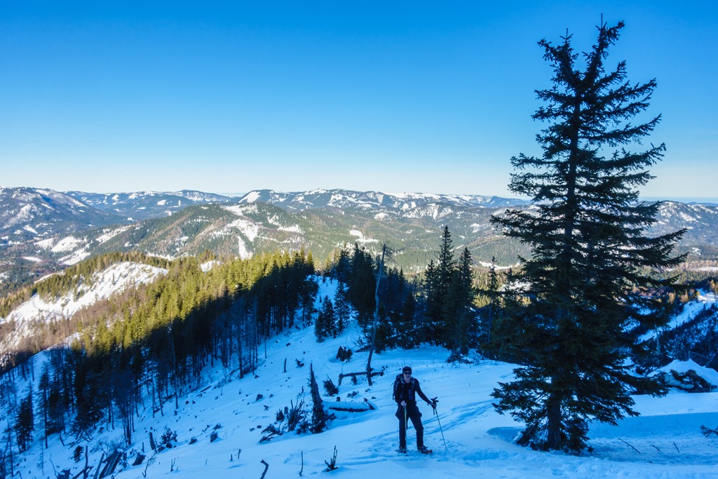 A mélyen behavazott vadonon át vezető út eleinte még szelíden emelkedik, majd fokozatosan bekeményedik. Szerencsére elég a sítalpak húzta nyomokat követni. Aznap kettes fokozatú a lavinaveszély és arról még nem hallottam, hogy ezen a helyen valaha lavina söpört volna végig. Felfelé haladtunkban mégis nyugtalanító érzés, hogy ez a szép meredek hegyoldal itt esetleg akár meg is lódulhatna alattunk.