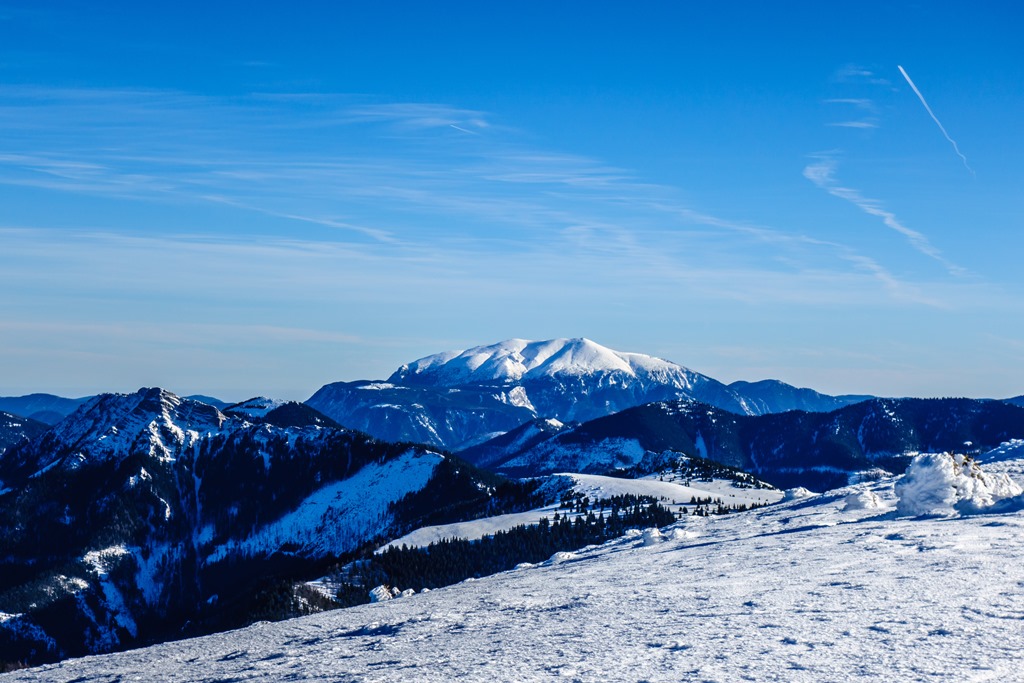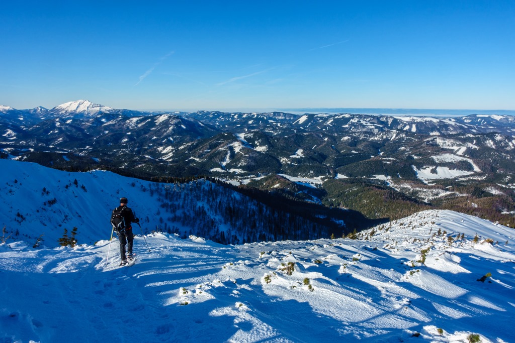 Gond nélkül érkezünk a Göller felé vezető gerincre (11:00). Az árnyékból kilépve, a ragyogó a napsütés feldobja a kedélyeinket. A panoráma egy álom. A méteres hóval fedett hegyvidék, a kristálytiszta levegő, a távolban kibontakozó ismerős kék-fehér hegyek puszta látványa ok egy-egy nagy adag eufóriára.