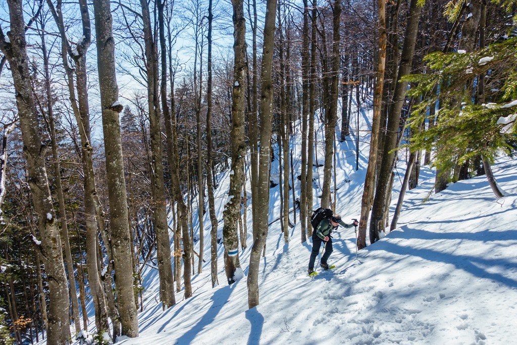Az erdőbe érve vége mindenfajta lazaságnak és kőkemény kaptatás következik. Igazi küzdelem a hóval. Sajnos a hótalpaink vaskarmai sok helyen nem érik el a puha hóréteg alatti jegesebb részeket, és hát az egyik traverznél kicsúszom. Lassan de megállás nélkül szánkázom a lejtőn lefelé. A kaptatás hevében még kesztyű sincs rajtam, így puszta kézzel próbálom magam fékezni, minek következtében, csak később látom, sikerül szép véres horzsolásokat begyűjtenem. Szerencsére egy fa megállít, komoly veszély nem fenyegetett. Első ijedtségemben befejezettnek tekintem aznapi akciónkat, mert ha ez itt ilyen terep, feljebb vajon még milyen lesz!