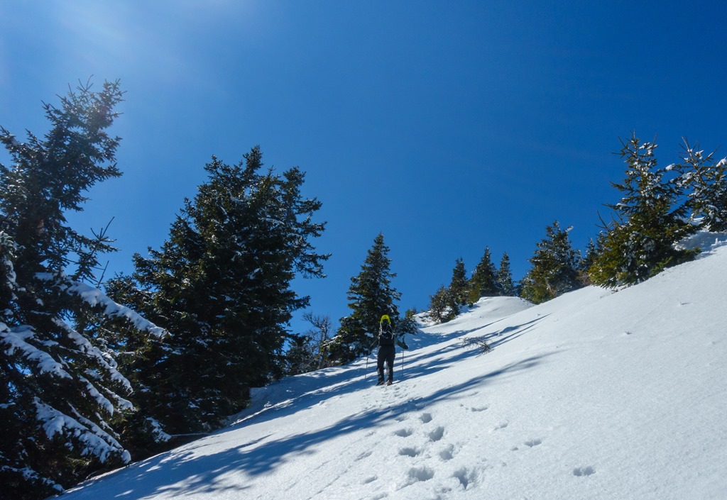 Ragyogó téli napsütés, csendes, stabil idő, cirka egy-másfél méteres hó, reggel enyhe fagy, később zsenge plusz fokok. Cakk-cakk-cakk! Egyenletes tempóban vágom a hágóvas orrát a napsütésben megpuhult hóréteg alatti keményebb, jeges rétegbe. Egy tucatnyi ilyen “cakk-cakk…” után pihenő következik. Éppen csak kifújom magam, aztán folytatódik a Schwarzaur Gippel keleti gerincének az ostroma. Bizony mondom, ehhez képest a téli Fadensteig egy kellemes kis séta csupán.
