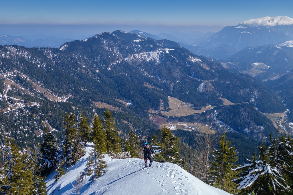 Eredetileg a Schneealpe lett volna vasárnapi célunk (Stájerország), de ott 3-as fokozatú a lavinaveszély. Túl rizikós! Marad tehát Alsó-Asztria hegyvilága, itt 1500 méter (az erdőhatár) felett sárga, tehát csak kettes fokozat van érvényben. A Schwarzauer Gippel (1605m) és gerince mindenképpen biztonságos (fenti kép).