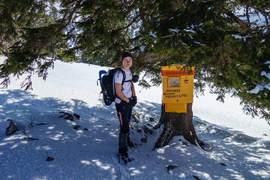 A nyeregbe 11:10-kor érünk (Preinecksattel –fenti kép). Itt sincsenek nyomok, ez elbizonytalanít, na, de lássuk a medvét! Nyugati irányba fordulunk és tekintélyes hóbuckákon át folytatjuk. Újabb, nem várt akadályokba ütközünk. 20-30 méteres, északi szél döntötte fenyők barikádjai keresztezik utunkat. A torlaszok néha szélesebbek, mint maga a gerinc. Néha úgy tűnik, egyszerűen nincs mód átjutni. Ilyenkor nem marad más hátra, mint leereszkedve megkerülni a blokkolt részeket, majd újra fel a gerincre. Kimerítő! Itt döntöm el másodszor, hogy visszafordulok, de Cirmi iránti betyárbecsületemnek engedve, némi habozás után folytatom a küzdelmet.