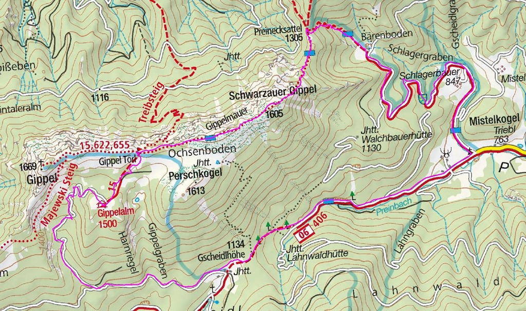 A Schwarzauer Gippelt az Oberbsergalmról. Pirossal jelöltem körülbelüli utunk vonalát. Balra a Perschkogel (1613m) jobbra a Göller (1766m). Kattint a képre teljes felbontáshoz.