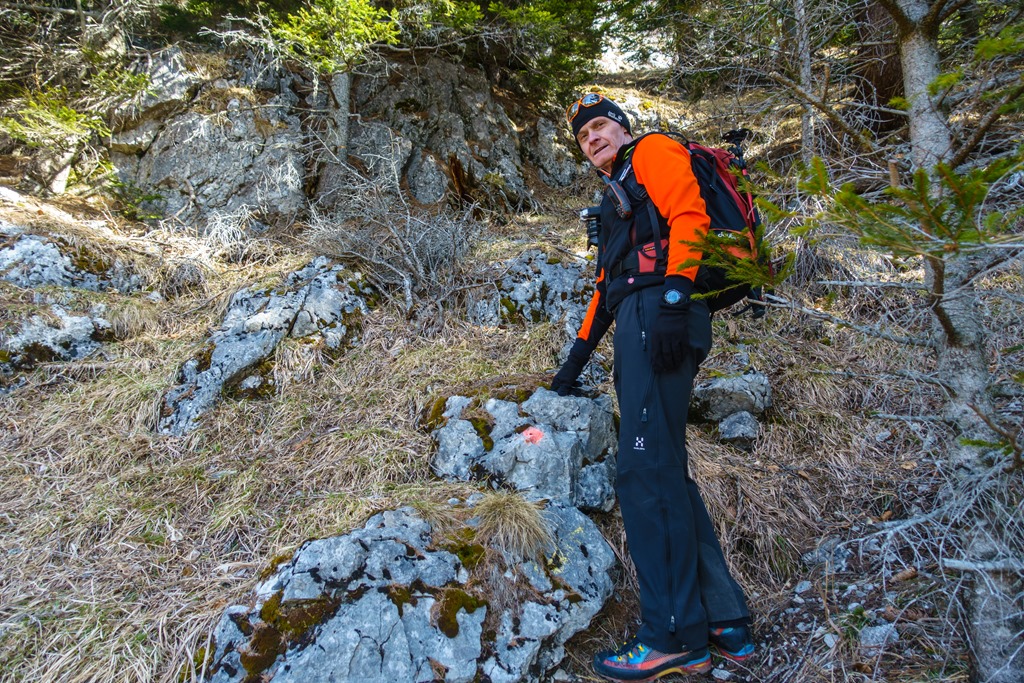 A Hengst tetejére vezető titkos kis ösvényt még tavaly becserkésztem, így most keresgélés és feles izgalmak nélkül vesszük a rövidke, de helyenként ugyancsak jó meredek kaptatót (10:30). Itt jártam óta megszaporodtak a tájékozódást megkönnyítő piros foltok. Egy jó lélek felfrissítette a már ugyancsak megfakult régi jelzéseket (lenti kép).