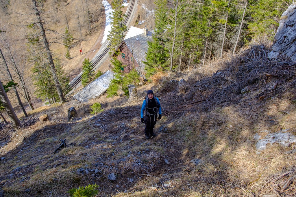 Két hajtűkanyar után a még téli álmát alvó Ternitzerhütte alá érünk (10:05 – fenti kép). Itt egy kis pihenőt szúrunk be, majd a meredek Bilekalmon át (lenti kép) érkezünk a Szalamandra fogaskerekű sínpárjához, illetve az Adolf Kögler-Haus tövébe.