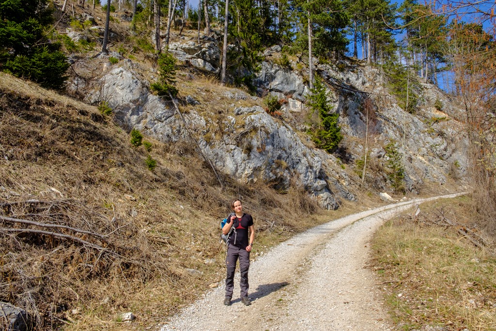 A továbbiakban északkeleti irányban ereszkedünk tovább a gerincen. Mivel kijelölt út nincs, vadregényes ösvényvadászat kezdődik. Egy helyen olyan sűrű az erdő, hogy inkább az alattunk jobb kéz felöl érkező erdészeti úton folytatjuk. Az út soron következő, szerpentines kanyarjában azonban ismét visszabátorkodunk az erdőbe (lásd a nyomvonalon). Az aljnövényzet itt gyérebb, a haladás egyszerű.