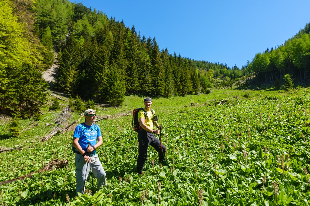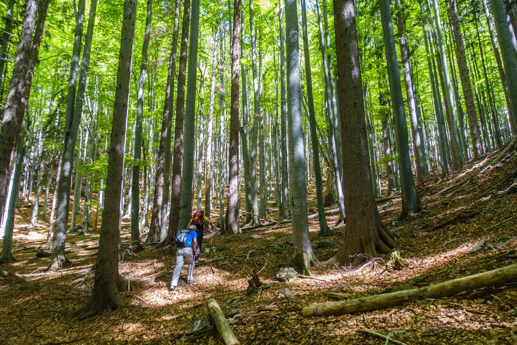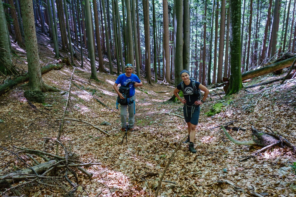 Az út fonala egyre nyilvánvalóbbá válik. Egy erdőháton traverzelünk. Jobbról maga a Krummbachstein törekszik a fejünk fölé, balra pedig a Krummbachgraben árka emelkedik lassan de biztosan haladásunk szintjére.