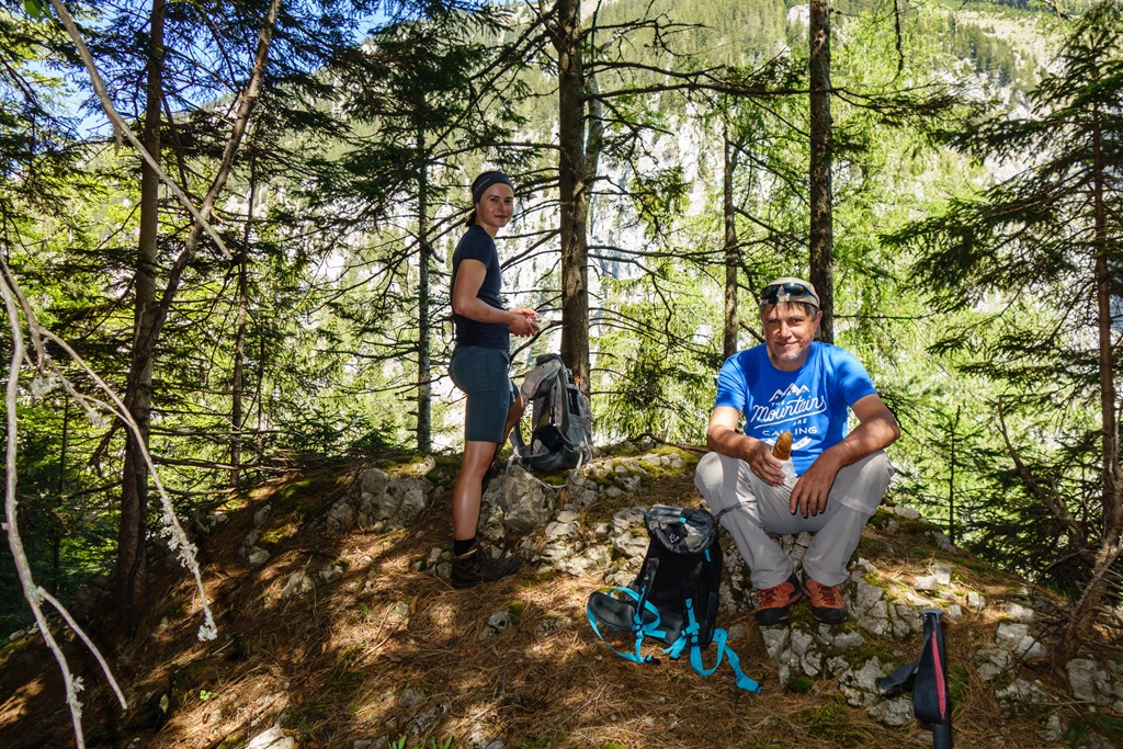 13:50-kor kelünk fel ismét az asztaltól és a jól jelzett standard turistaúton (Miesleitensteig) indulunk vissza a völgybe. A Miesleitensteig középső szakasza drótkötelekkel biztosított, sziklamorzsalékkal felszórt, alattomos és meredek. Az ereszkedés így sem tart 2 órát. Már 15:40-kor kibukkanunk Kaiserbrunnban.