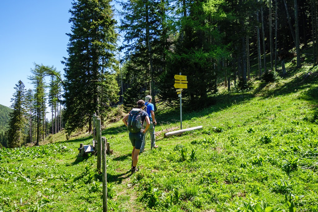 A Schneeberget a Krummbachsteinnel, az 1333 méteren fekvő Krummbachsattel köti össze. A nyereg lankásan nyugatra lejtő része a Krummbachgrabenben folytatódik. A két hegy közé itt egy lefelé szűkülő hegyi legelő (Schlossalm) ékelődik be. Valamikor régen, tehenek kérődztek a réten, és ahová a Kuhsteigen hajtották fel a csordát. Nos, az idevágó beszámolók elemzése után, Cirmivel és Sanyival úgy döntünk, hogy felderítjük ezt a történelmi ösvényt.