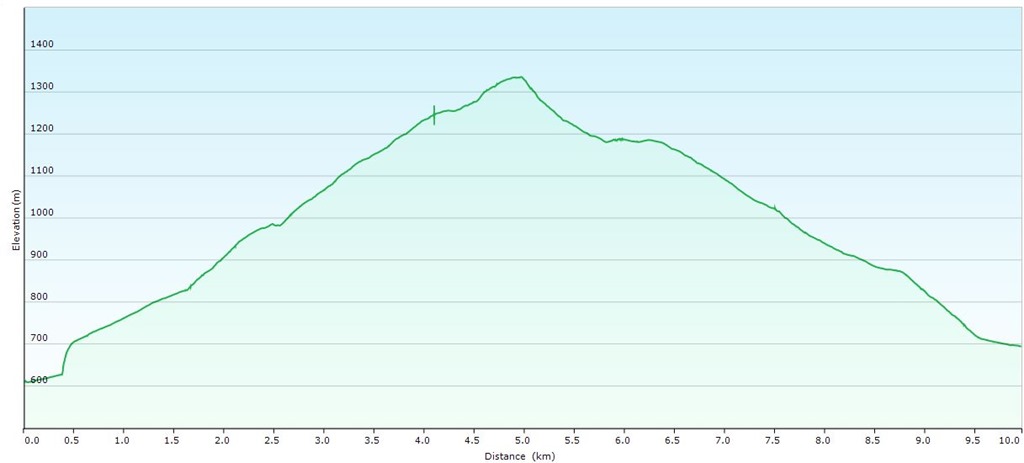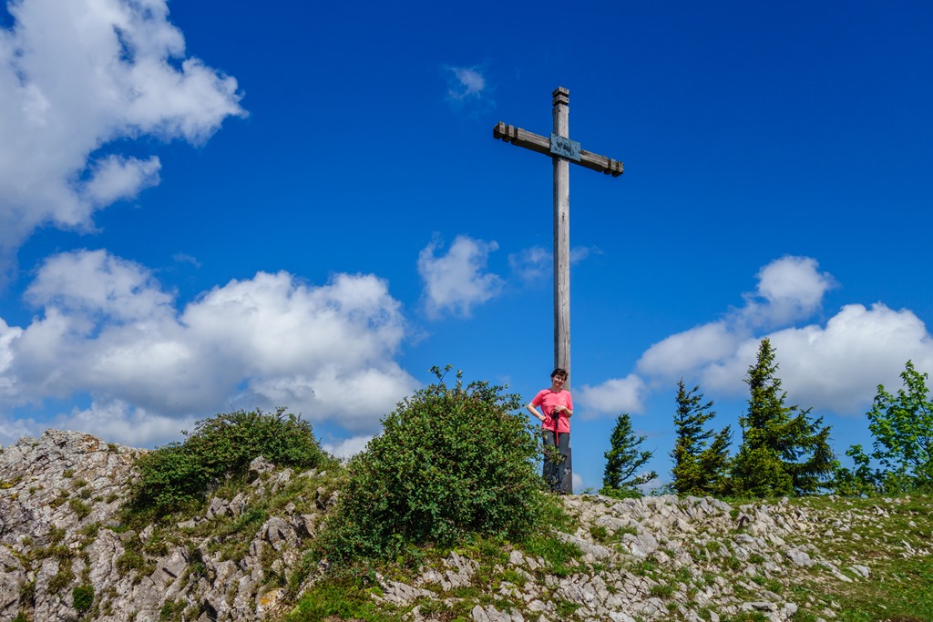 Itt először szelíden emelkedünk, majd a csúcs előtt jól bekeményít a kaptató. Én már jól ismerem a járást, de Angikát bizony meglepi az emelkedő dőlésszöge. Az akadály ellenére is már 11:30-ra a jó magas fakereszthez érünk.