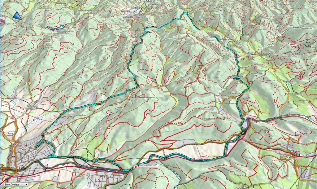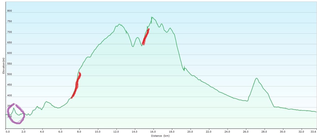 Pottensteilből indulok. Az útvonal mindjárt az elején letesztel, ugyanis a lilával karikázott helyen rám szabadít egy “ágaskodó paripám” címszós kis felszökést. Nem hosszú, de ha itt mindjárt le kell lépned, úgy akkor inkább fordulj szépen vissza. Nem neked való az, ami még jönni fog!