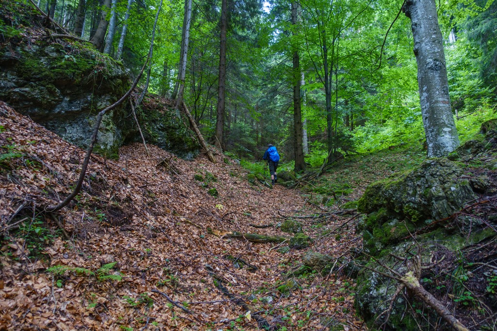 Alig hagyjuk magunk mögött a vad sziklavilágot és elered az eső. Alkalmazkodunk a körülményekhez, de figyelmünk lankad, minek következtében elvétjük a rendes utat. Ami tulajdonképpen nincs is, mert jelek nem igazítanak útba. Ahol egy széles, egyenesen tovább vezető erdészeti út balra fel elágazik, nos ott követjük el a hibát. Mi egyszerűen haladunk tovább az árok mélyén.