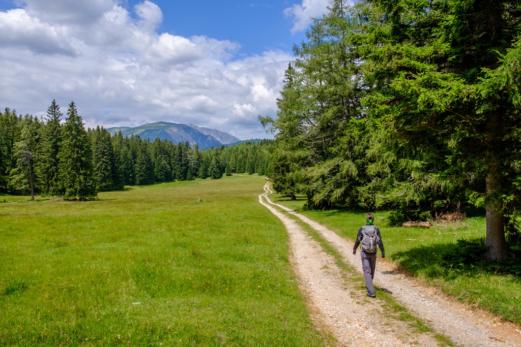 Délkeleti irányban lépegetünk kissé álmosan az aszfaltúton felfelé, miközben az egyre csak komorodó eget fürkésszük. Később mezők mezsgyéjén (fenti kép), majd erdőben ereszkedünk a Gadenweither-Klamm (szurdok) szintjére.