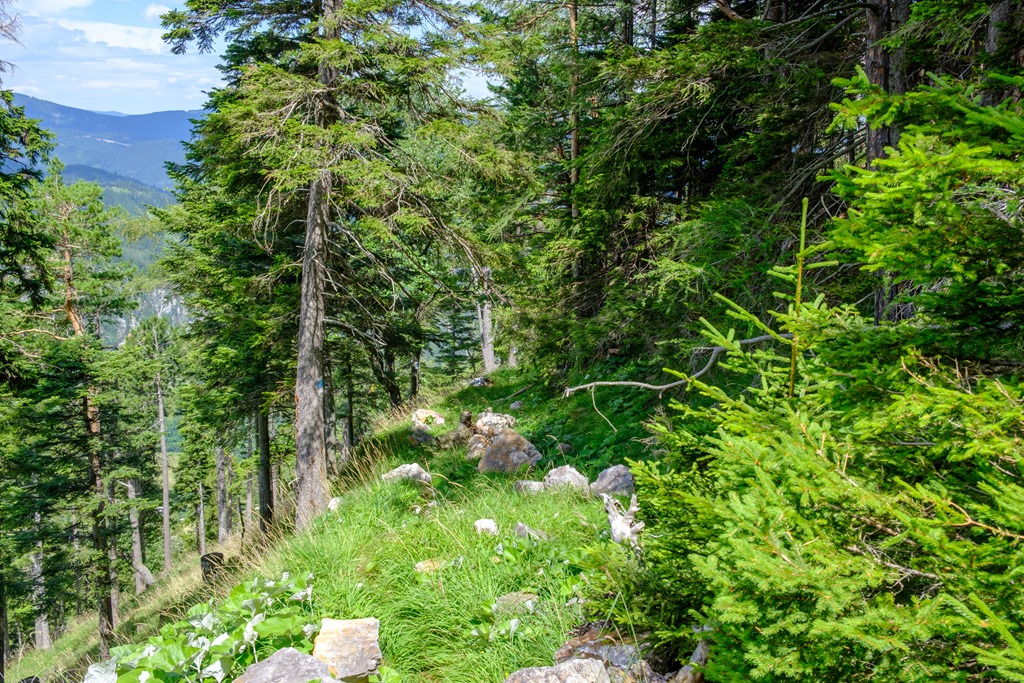 9:55-kor fordulunk le a széles útról jobbra be a szurdokba. Egy hivatalosan jelölt ösvényről lenne szó (bergfex.at-szerint), de erre utaló jelek alig-alig vannak. Egy évtizedek óta fatörzsön rozsdásodó plakett mellet elhaladva vékony csíkba vesző csapáson kaptatunk enyhén felfelé. A nyomokból ítélve nem egy felkapott turistaút.