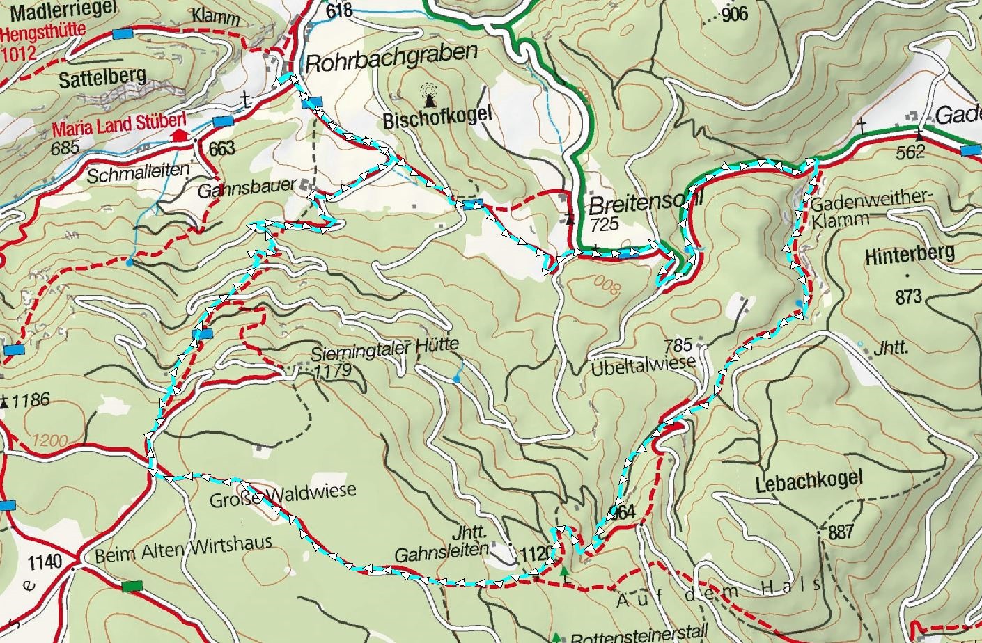 A későbbiekben aztán sűrűsödnek a fákra pingált jelek, majd gond nélkül elérjük a Gahns platóját, ahol legnagyobb örömünkre végre napsütés fogad. A Große Waldwiesen még szép panorámát is kapunk ajándékba (lenti kép), pedig már lemondtunk róla, hogy erdőn kívül más kilátásban is részünk lesz.