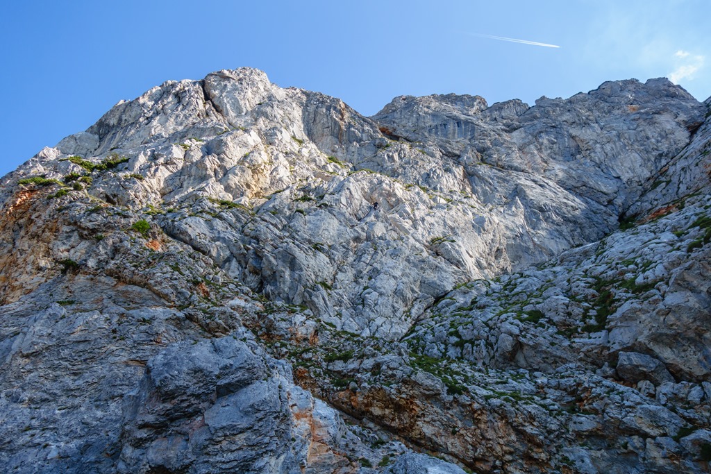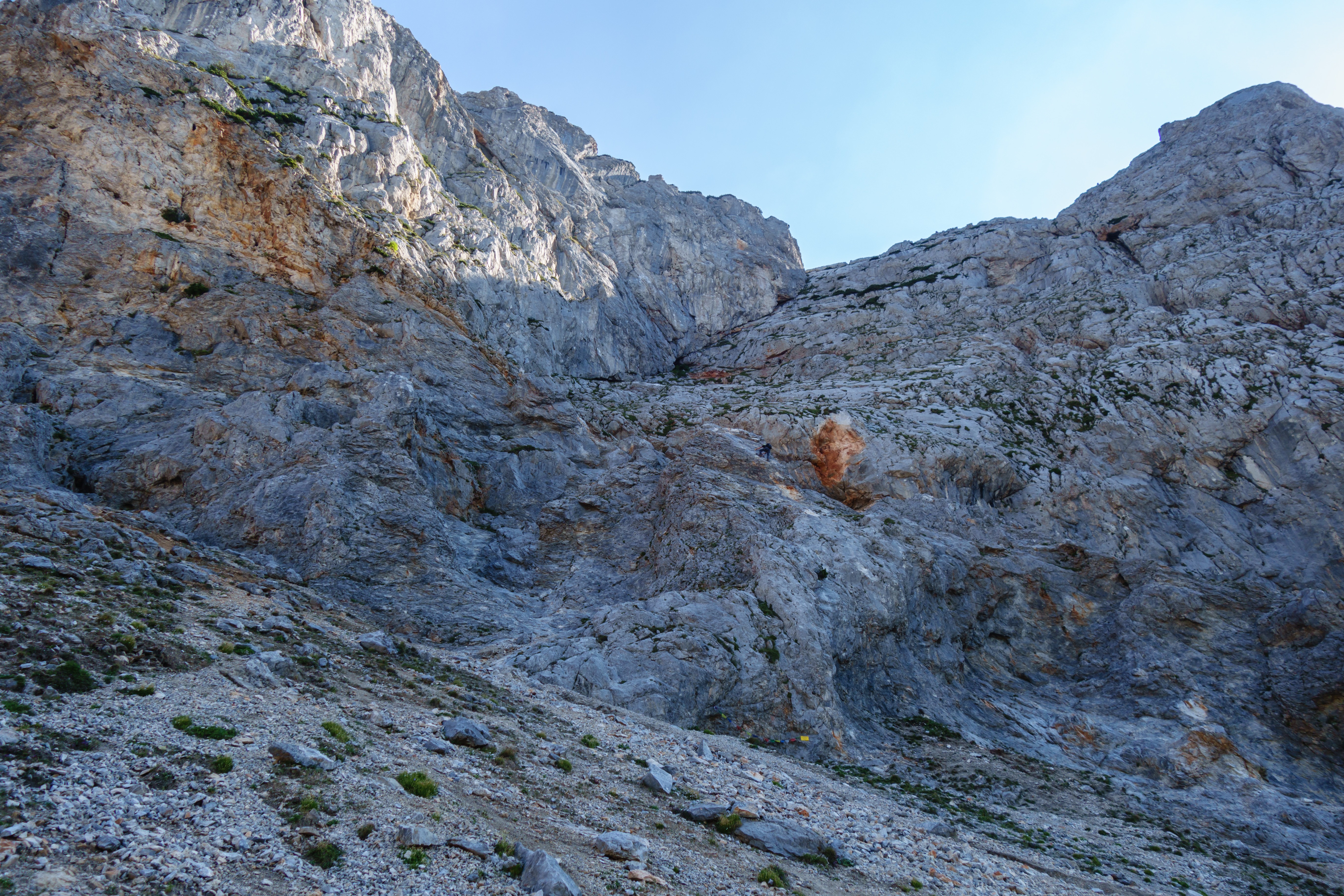 Szerintem a bergsteigen.com a beszálló megközelítését megtévesztően ismerteti: “Bei einer markanten roten Schuttrinne (Markierung, 1495 m) zweigt man vom Weg ab und quert man nach rechts zum Einstieg (1520 m) an einem Pfeiler”. Egy markáns vörös sziklatörmelék árokról beszél (lásd fenti képen balról húzódik középtáj felé), de ha ezt elérnéd, akkor már túlhaladtál. Korábban kell jobbra térni és egy sziklapillér felett egy vörös folt szerint orientálódni. Pontosan alatta van a beszálló (lenti kép).