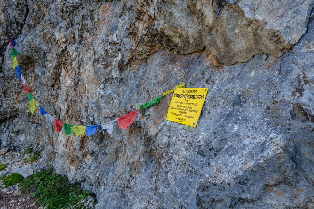 9:37-kor végre elérem a tibeti imazászlókkal feldíszített beszálló előterét, ahol nyugodtan be lehet öltözni, van rá alkalmas hely. A mászás mindjárt szilajul indít, és teljes erőbedobást igényel, majd később szelídül. A tulajdonképpeni fő attrakcióig, a barlangig (10:15) egy teljesen normális C/D Klettersteig formáját mutatja. A falrajz szerinti D/E egy kamu. Várom, hol lehet, mikor jön, de nincs sehol D/E, legfeljebb D, de inkább csak C/D.