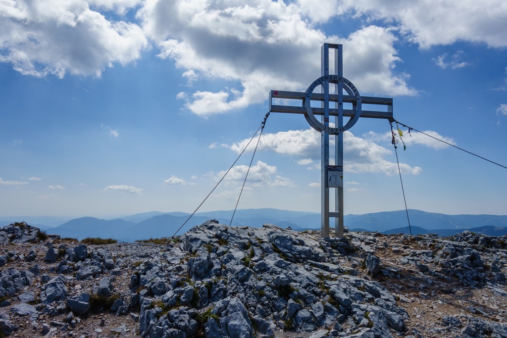 1:10 óra elteltével (10:45-kor) elérem a Klettersteig végét. Ebből a perspektívából még nem láttam a Raxot, ez is újdonság. Még felbaktatok a Preinerwand csúcskereszthez (10:55 – kép) majd jöhet az elektrolitok pótlása a Neue Seehüttében (11:15).