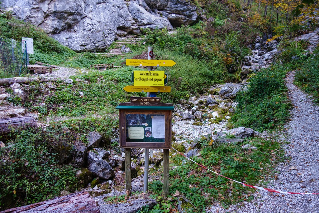 Nos, mit ad a sors, éppen ráfordulnék a Weichtalhaus tövéből induló útra (7:55), amikor íme (kép), látom ám, hogy a szurdok le van zárva. Nem tájékozódtam idejében, pedig a gipfeltreffen.at oldalon “Wegsperren, Behinderungen, Sanierungen” címszó alatt olvasható (utólag megtaláltam).