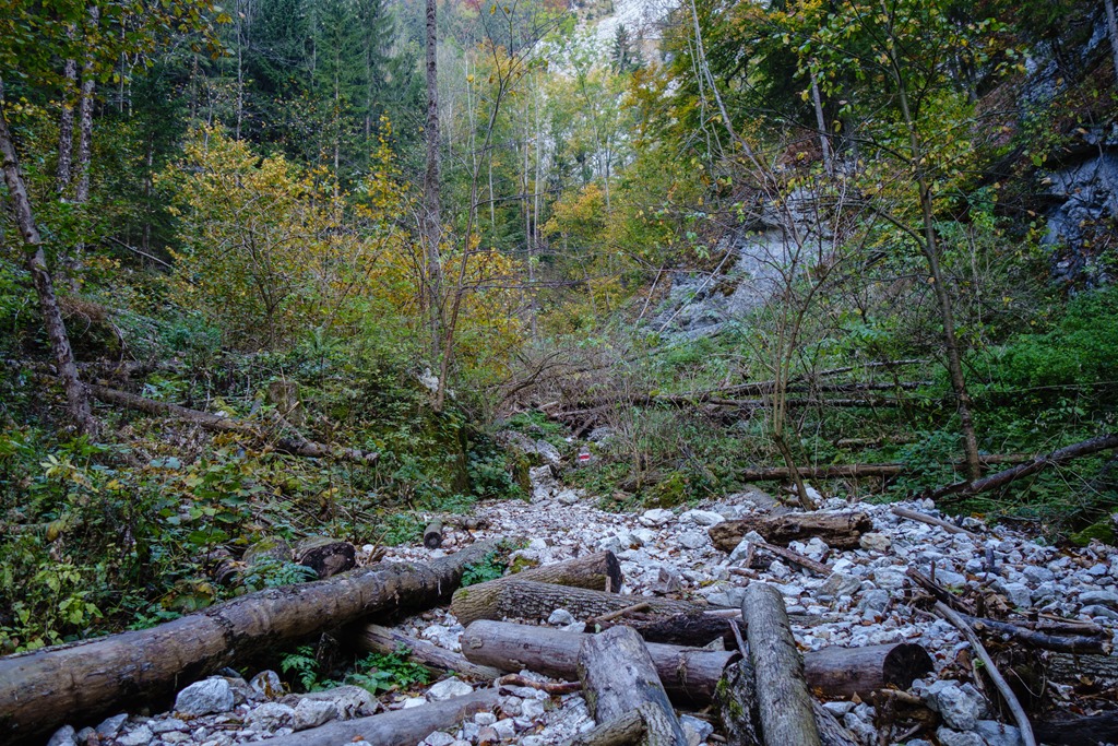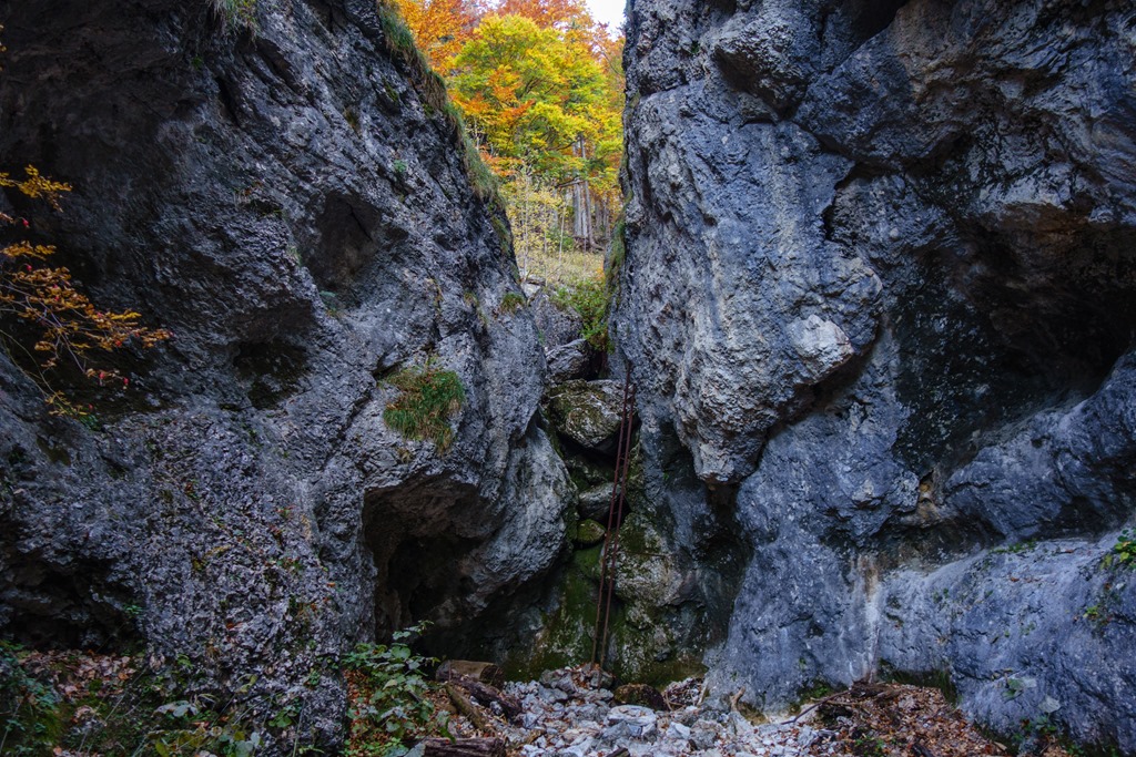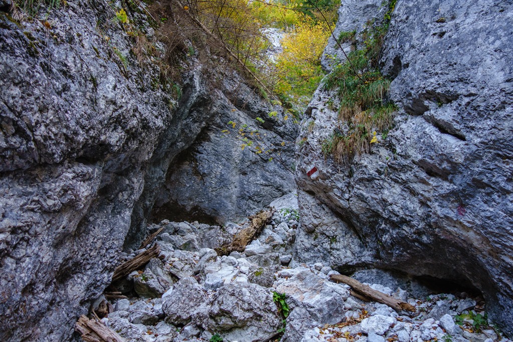 Nos, tehát mit tegyek? Az alternatív Ferdinand Mayr-Weget lefelére szántam, elég unalmas. Fülelek, hallani-e láncfűrész sikítását, de csendes, nyugodt minden. Közben érdekes dolog történik velem. Amint alternatívák sorozata villan a képzeletembe, (Stadelwandgraben, Rax, Alpenvereinsteig, stb.) a lábaim maguktól átlépik a sárga “Sperre” táblát és már csak azt veszem észre, hogy haladok szépen a szurdokban. Na, most jól kibeszéltem magam.