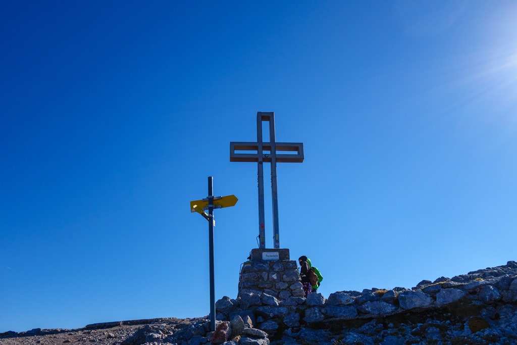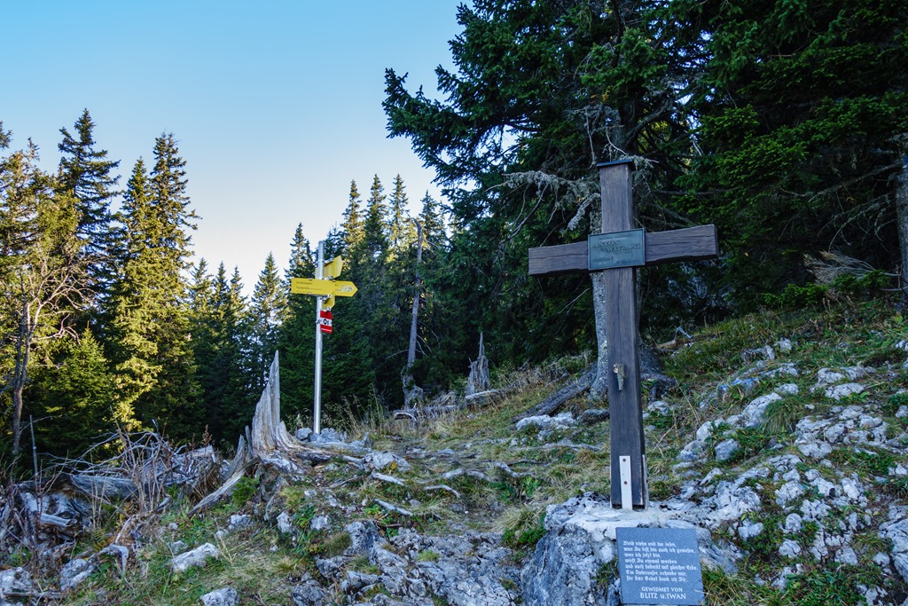 A szurdok végétől még cirka 25 perc kaptatás a Kientalerhütte (10:00). A következő tájékozódási pont a Witzani kereszt további 25 percnyire (10:23). A sárga útjelző itt 1:45-ben szabja meg a Klosterwappenig tartó utat. 11:44-kor érkezem a kereszthez, azaz 1:21 alatt. Nem tudom, hogy vajon jó formában vagyok-e, avagy csak a táblák veszik lazán, útközben ugyanis két virgonc fiatal páros is leelőz.