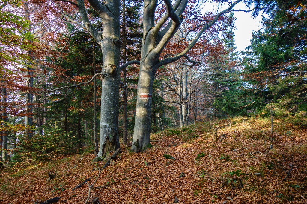 Hogy némi sava-borsa is legyen a menetelésnek, új, eleddig ismeretlen ösvénnyel próbálkozom, ami, mint kiderül, egy cirka 20-22 perces izzasztó. A jelzett helyen (9:35) jobbra fel elhagyom a jól ismert Marschsteiget, hogy egyenes úton mihamarabb elérjem a Kieneck gerincét (9:56). Halványan kivehető egy csapás, a tájékozódás egyszerű.