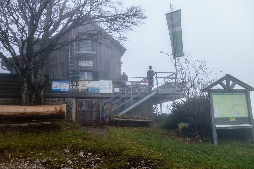 Nem várt gyorsasággal érkezünk a platóra, miközben még egy párost is megelőzünk. Nocsak, minő erőtartalékok munkálkodnak Angikában! Odafen, aztán belegyalogolunk az éppen terjeszkedőben levő ködbe. Közel már a jól fűtött menedékház. Az iménti napsütésnek köszönhetően még szép számmal ücsörögnek vendégek az Enzianhütte teraszán. Mi viszont egyenesen a még szinte üres vendégszobába megyünk. Utóbb is jó döntés, mert cirka fél óra elteltével az alaposan megsűrűsödő hideg köd miatt még a legedzettebbek is bemenekülnek.