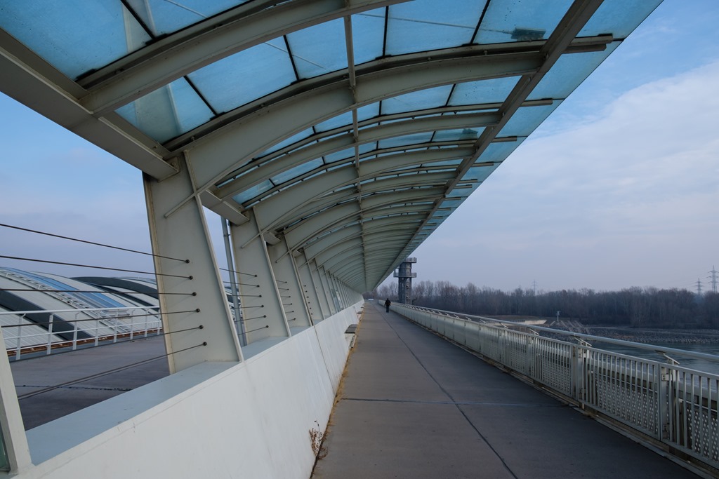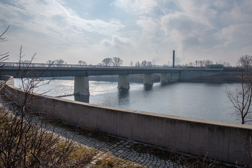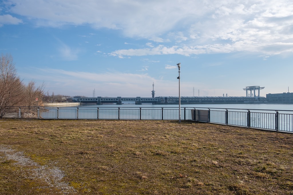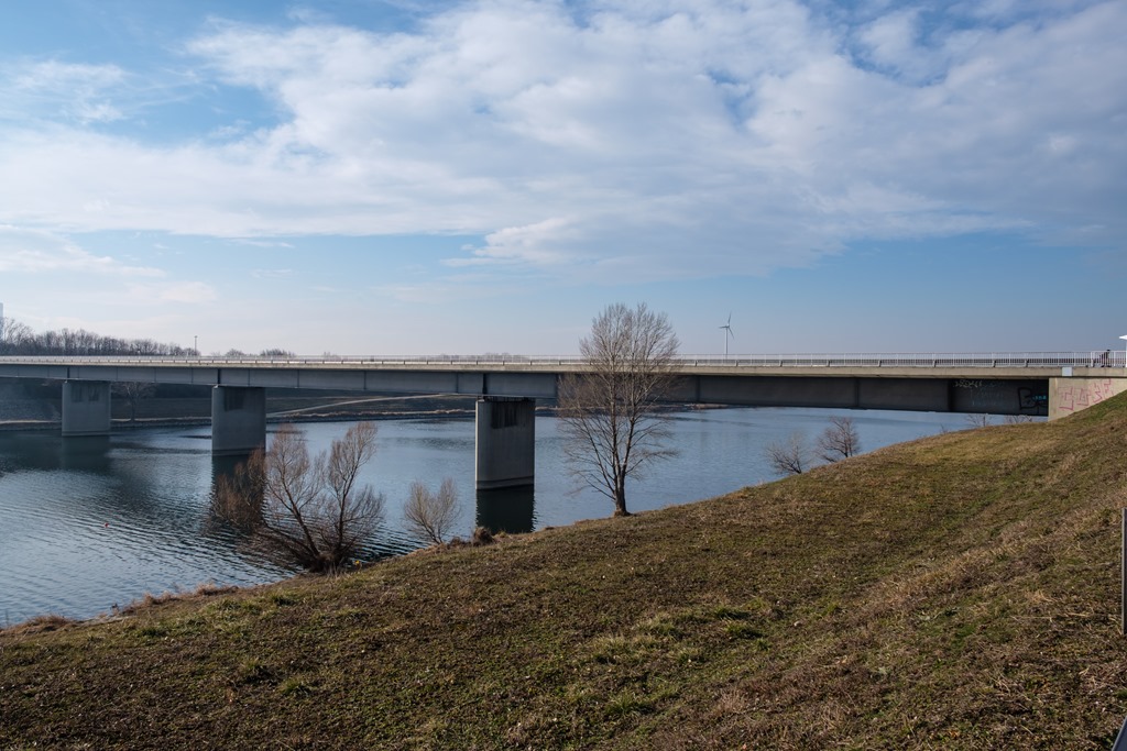 Szombat, szép napos idő, a Freudenau melletti kicsiny parkoló feltehetően színültig telített, ezért már jóval előtte, az Ettrichstrassen állítom le az autóm. Átcammogok a vízierőmű gátján (lenti kép) a Duna szigetre, majd délkeltnek fordulok, ugyanis lejjebb van egy neve nincs híd, amin majd átkelhetek a Duna északi oldalára.