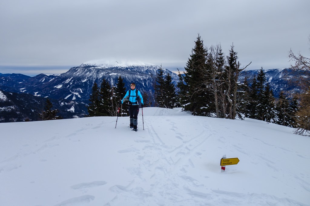 Egy alternatív úton, az Obersberg-Almon át, kívánunk leereszkedni. Kémlelem árgus szemekkel, vannak-é arrafelé nyomok, de csak szűz hó amerre tekintgetek. Mivel már legalább háromszor volt szerencsém arra járni, bevállaljuk az ereszkedést az érintetlen hómezön át. És ez remek döntésnek bizonyul. Tudniillik jön a pihepaplanos könnyed ereszkedés a finom porhóban. Ha semmi másért, ezért érdemes felkaptatni a hegy ormára.